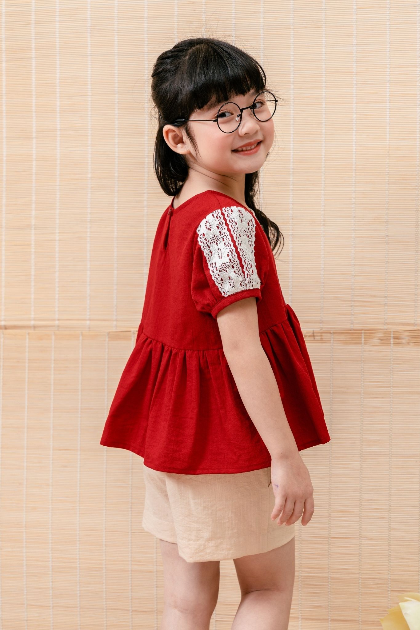 Đặc điểm: Bộ ngắn tay phối ren, 100% đũi bamboo, quần đũi bamboo, bé và đi chơi đều xinh.