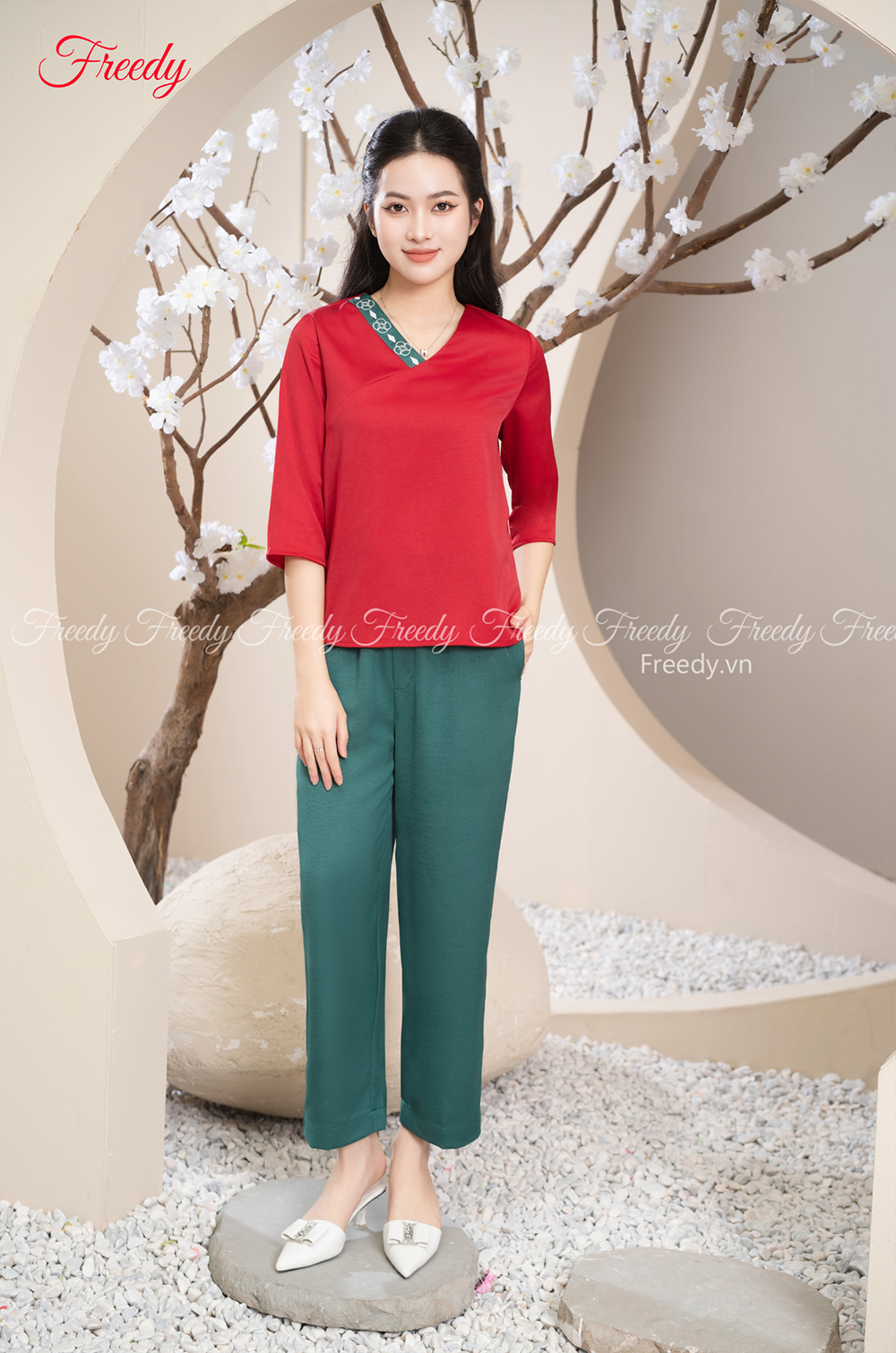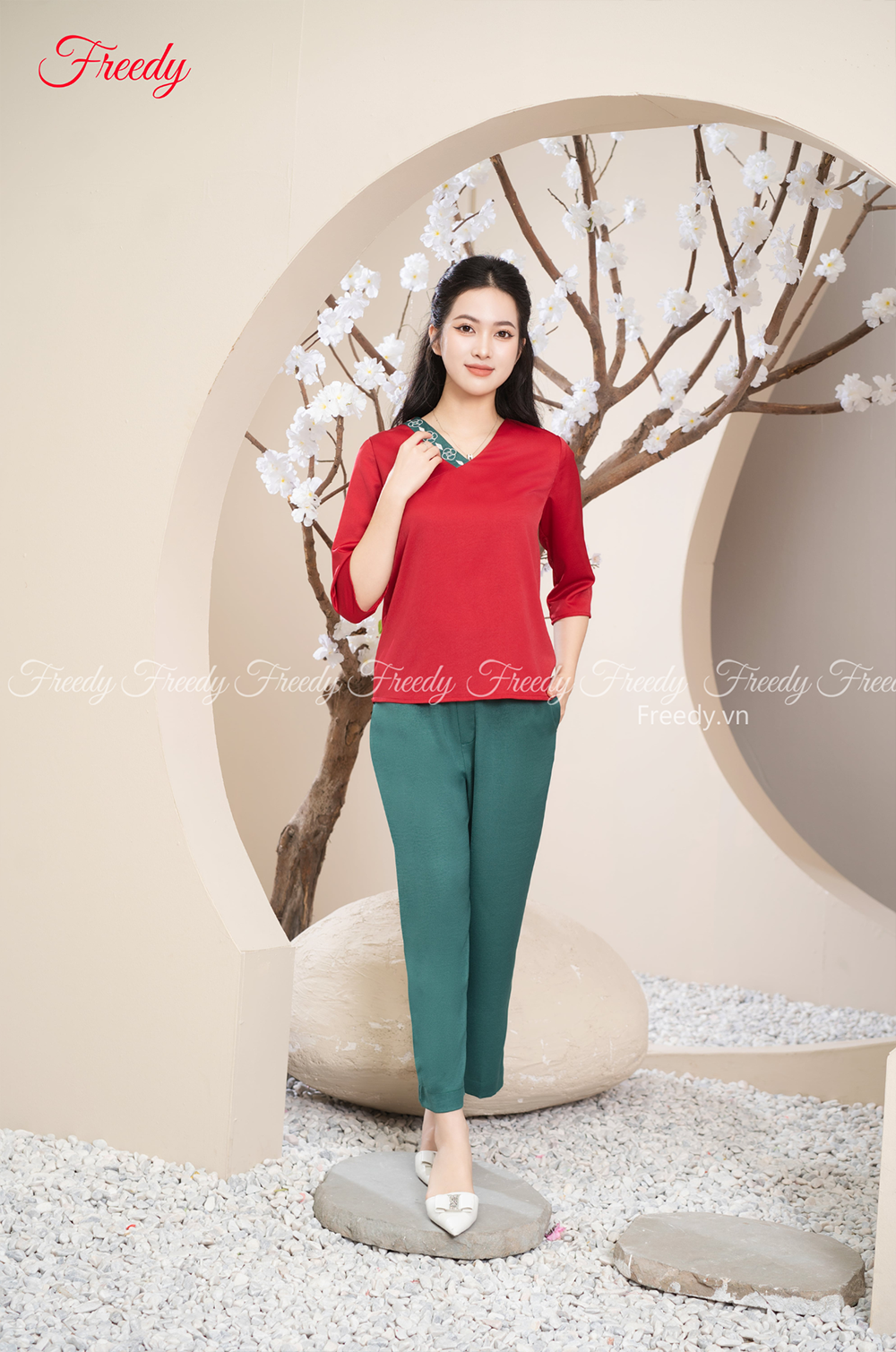 "Bộ dài tay lụa tằm thêu cổ V" nằm trong BST mới nhất Freedy mang đến cho các nàng một màu sắc mới