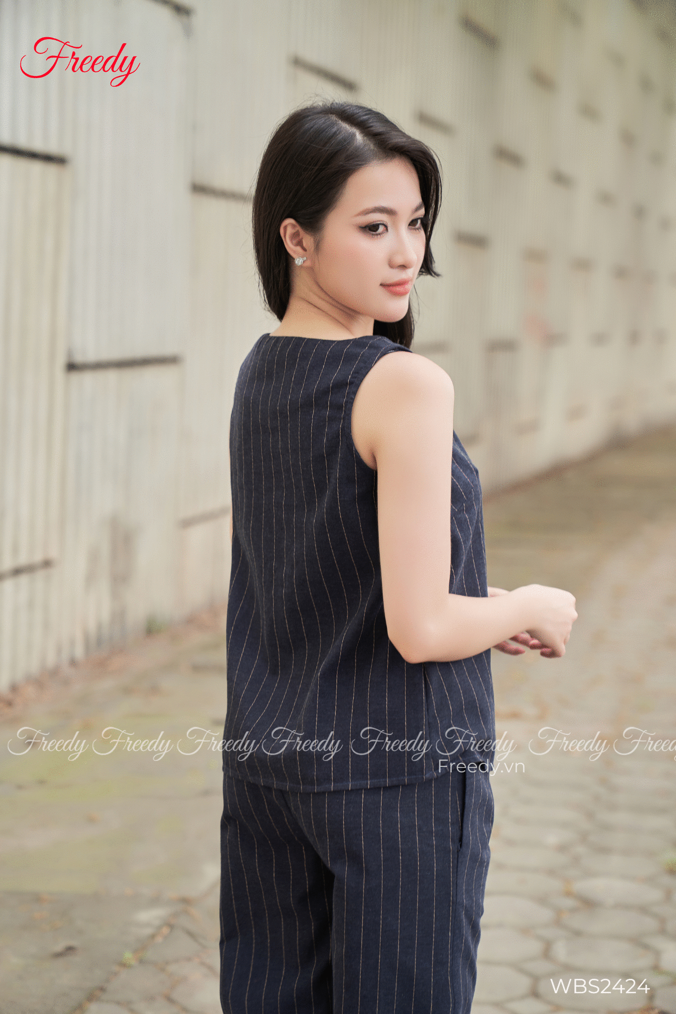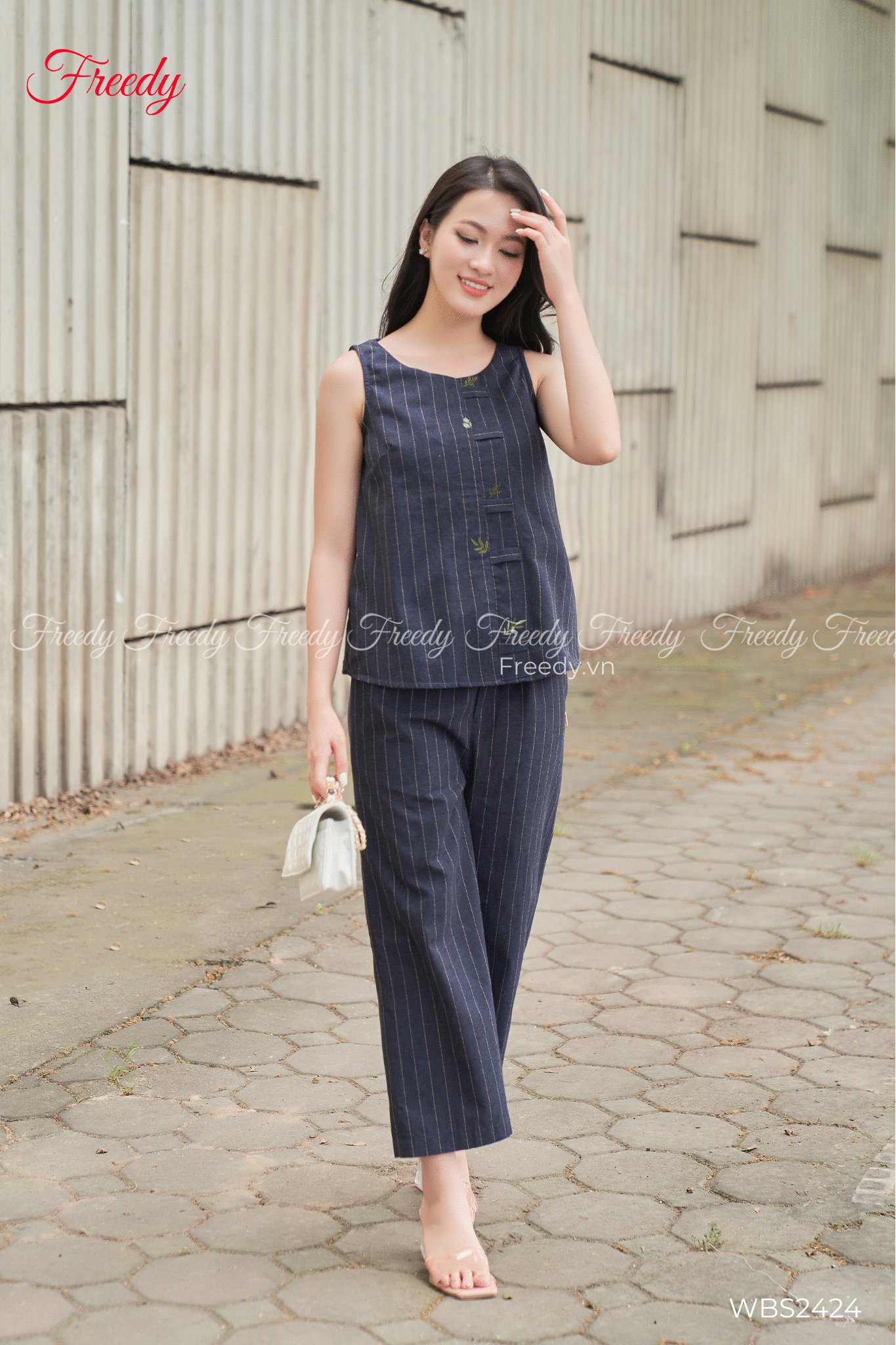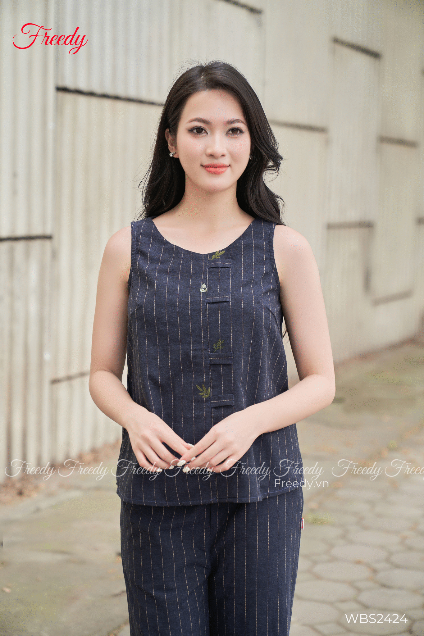 * Điểm nhấn thiết kế: Bộ linen sát nách kẻ với điểm nhấn là những họa tiết hoa được thêu ở nẹp áo, nhìn tổng thể đơn giản nhưng lại rất tinh tế. Áo sát nách kết hợp với quần dài cùng chất liệu không chỉ mang đến sự tinh tế mà còn tạo nên sự sang trọng cho người mặc