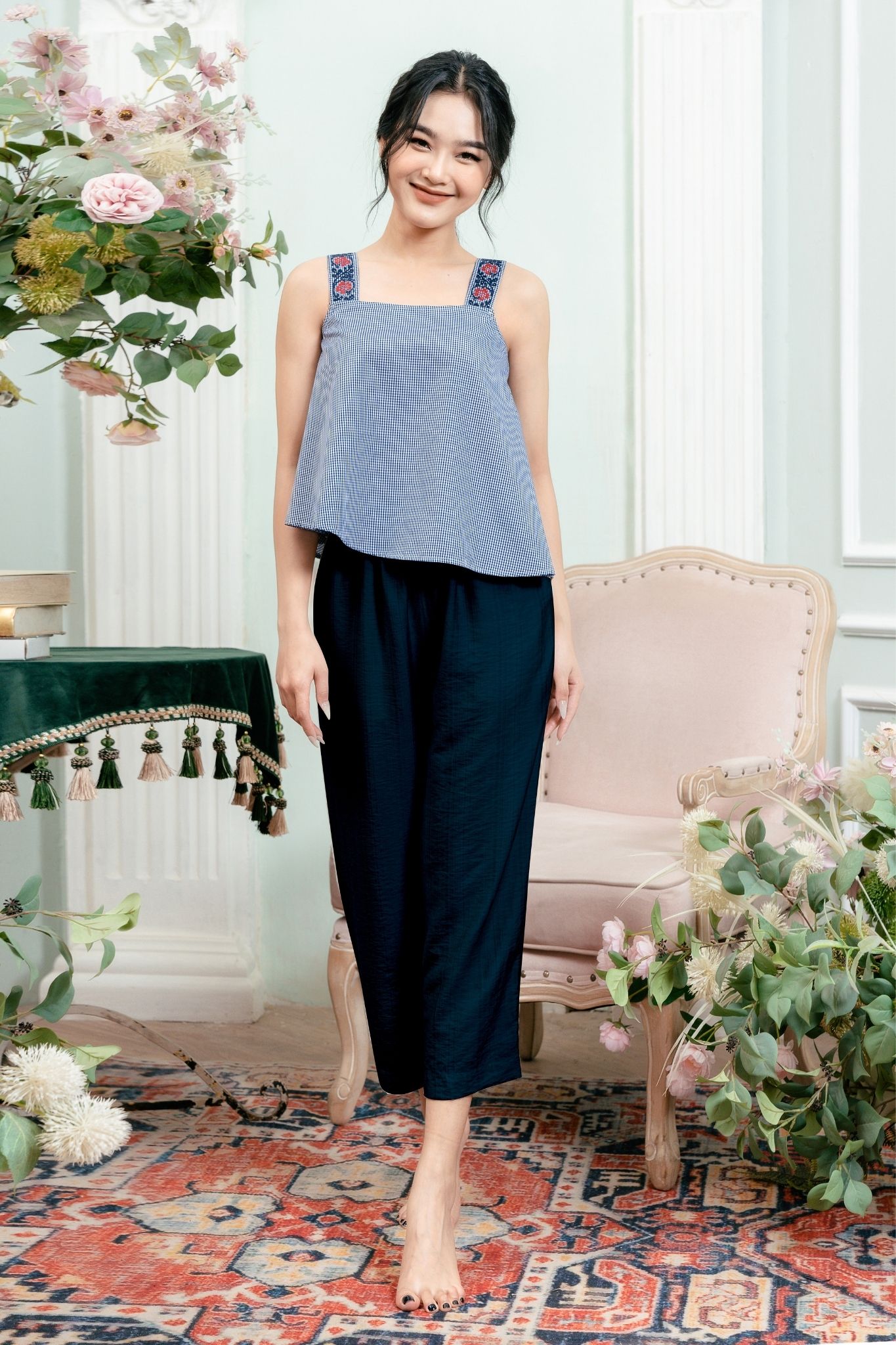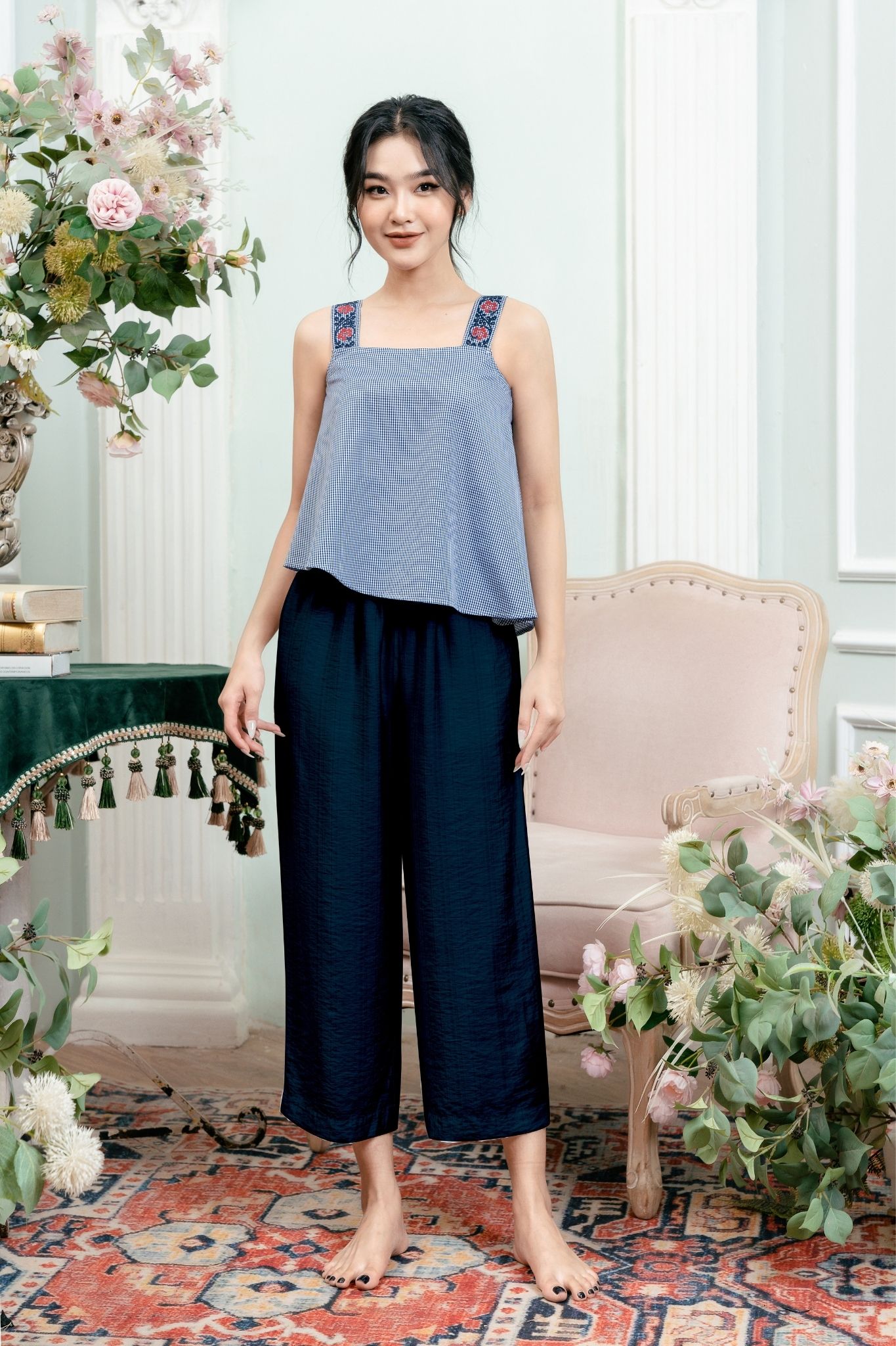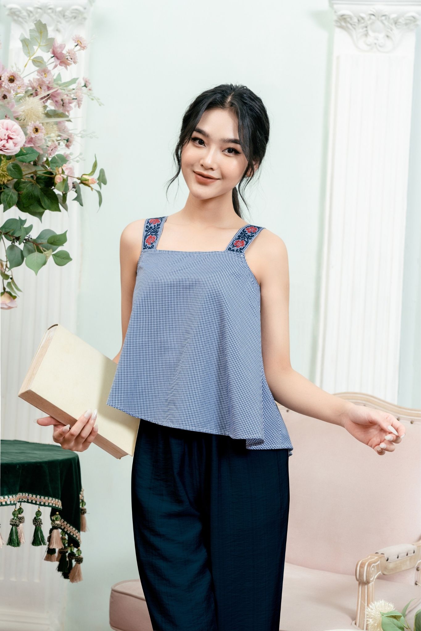 Đặc điểm: Bộ 2 dây caro, quần xanh, thêu hoa. Chất liệu áo cotton, quần đũi bamboo. Sản phẩm giúp chị em mặc nhà hay mix đồ đi chơi, đi biển.