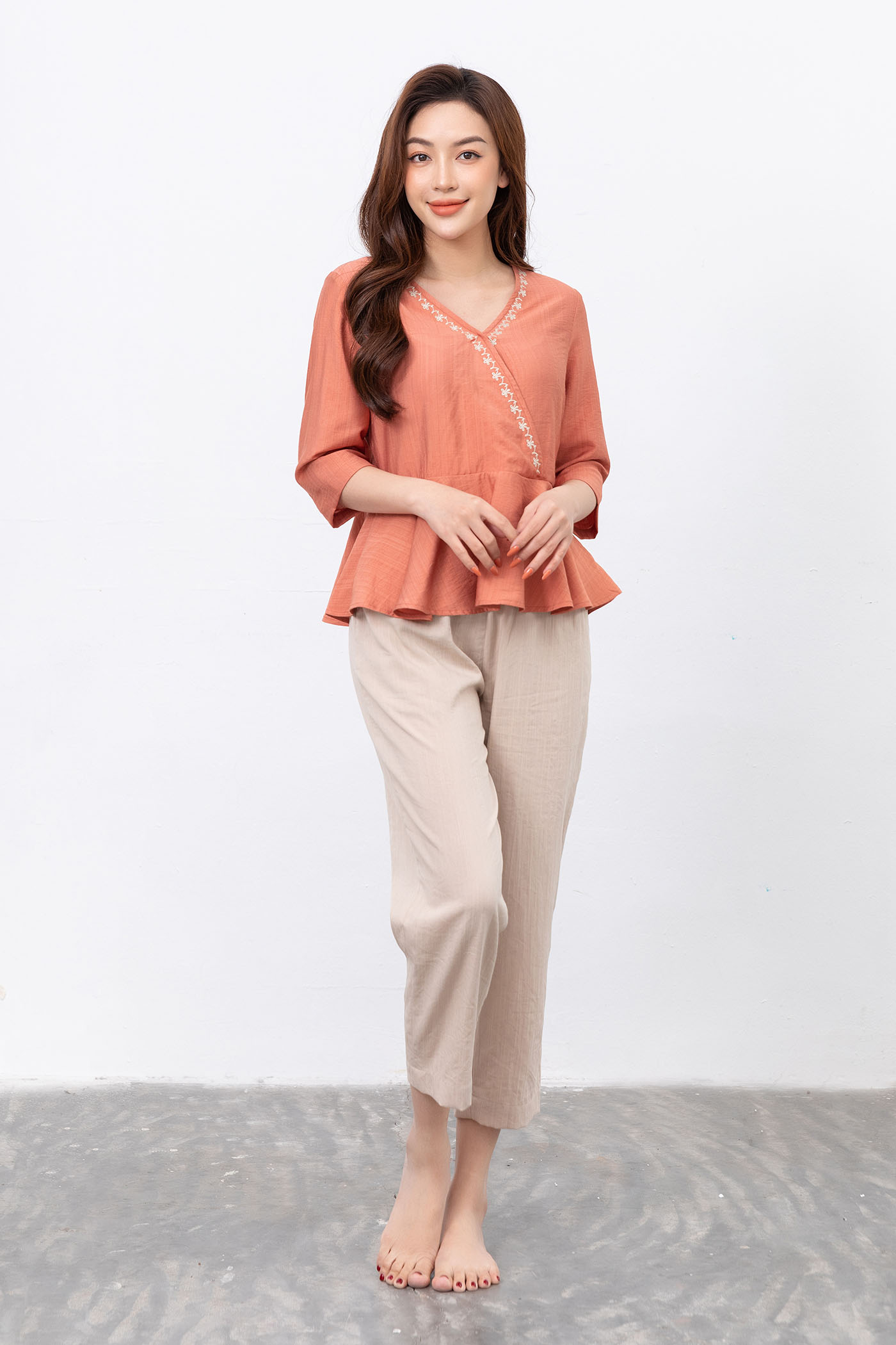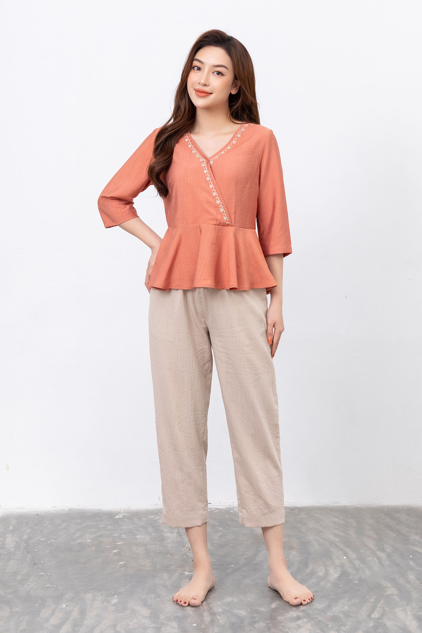 Nét truyền thống trong thiết kế hiện đại, bộ đồ tái hiện mang phong cách mộc mạc nữ tính diện tết siêu xinh, chất sợi đũi bamboo sợi tre tự nhiên, những đường cong của bộ đồ được uyển chuyển nhất. Điểm nhấn eo tính tế chia tỉ lệ cơ thể hợp lý sẽ giúp nàng trông trẻ trung và gọn dạng hơn.