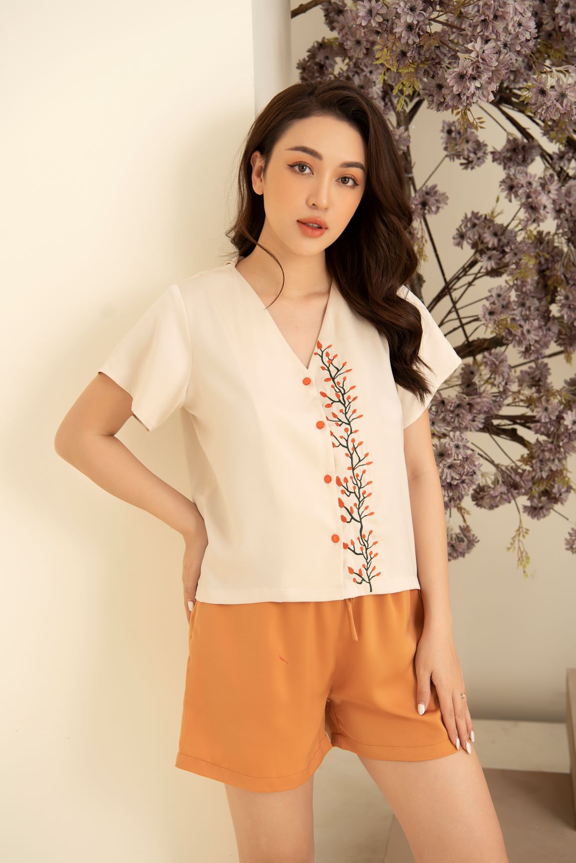 Với điểm nổi bật của bộ đồ ngủ mặc nhà: Tông cam nhẹ kết hợp với màu be sữa nhạt giúp cho nàng vừa có sự trẻ trung tươi mới, vừa lịch sự thời trang. Hàng hoa thêu nổi bật giữa dọc thân ngực áo nổi bật cho nàng thêm phần quyến rũ!