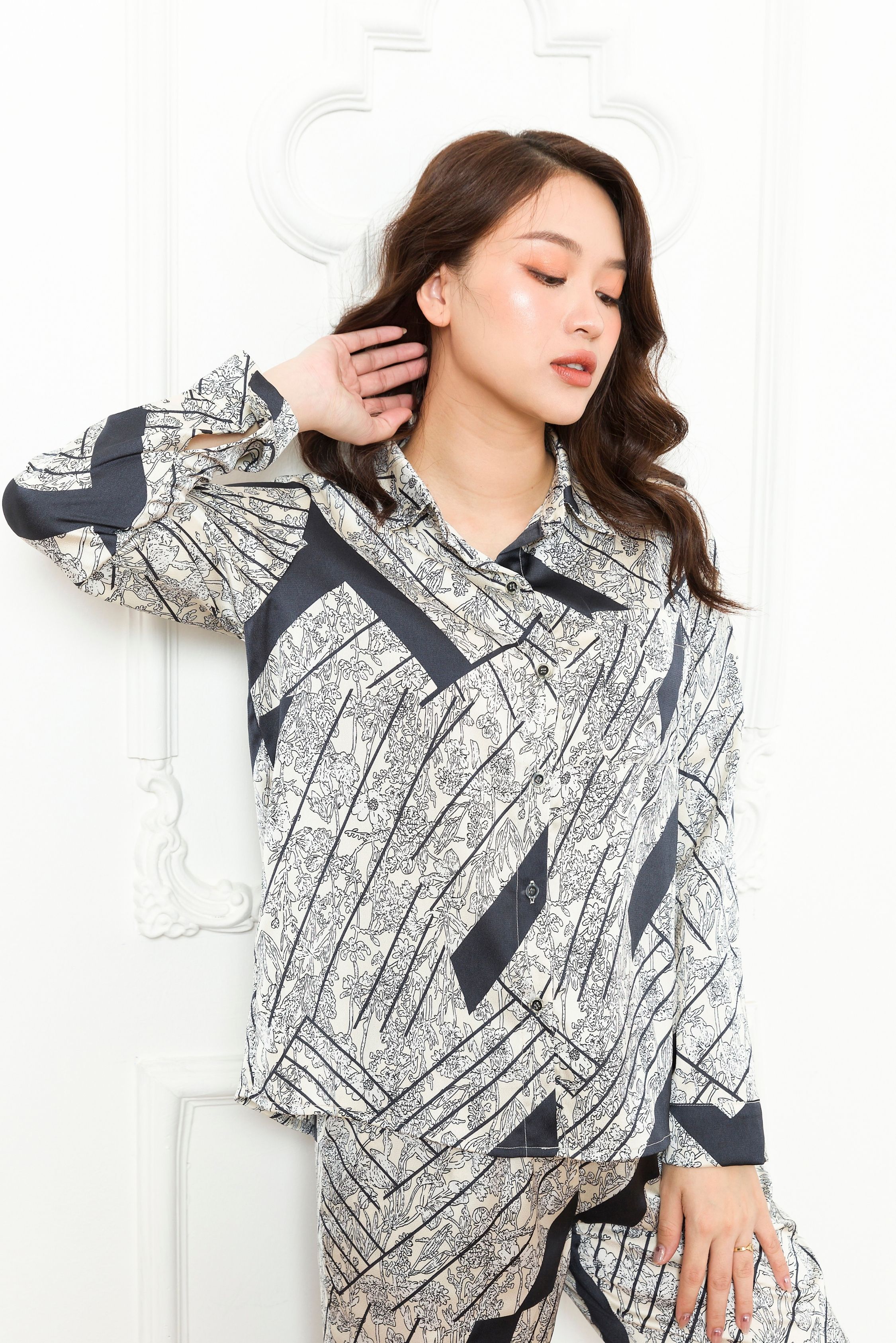 Thiết kế dáng dài tay họa tiết lạ mắt kết hợp màu xanh than vừa nhẹ nhàng vừa cá tính.