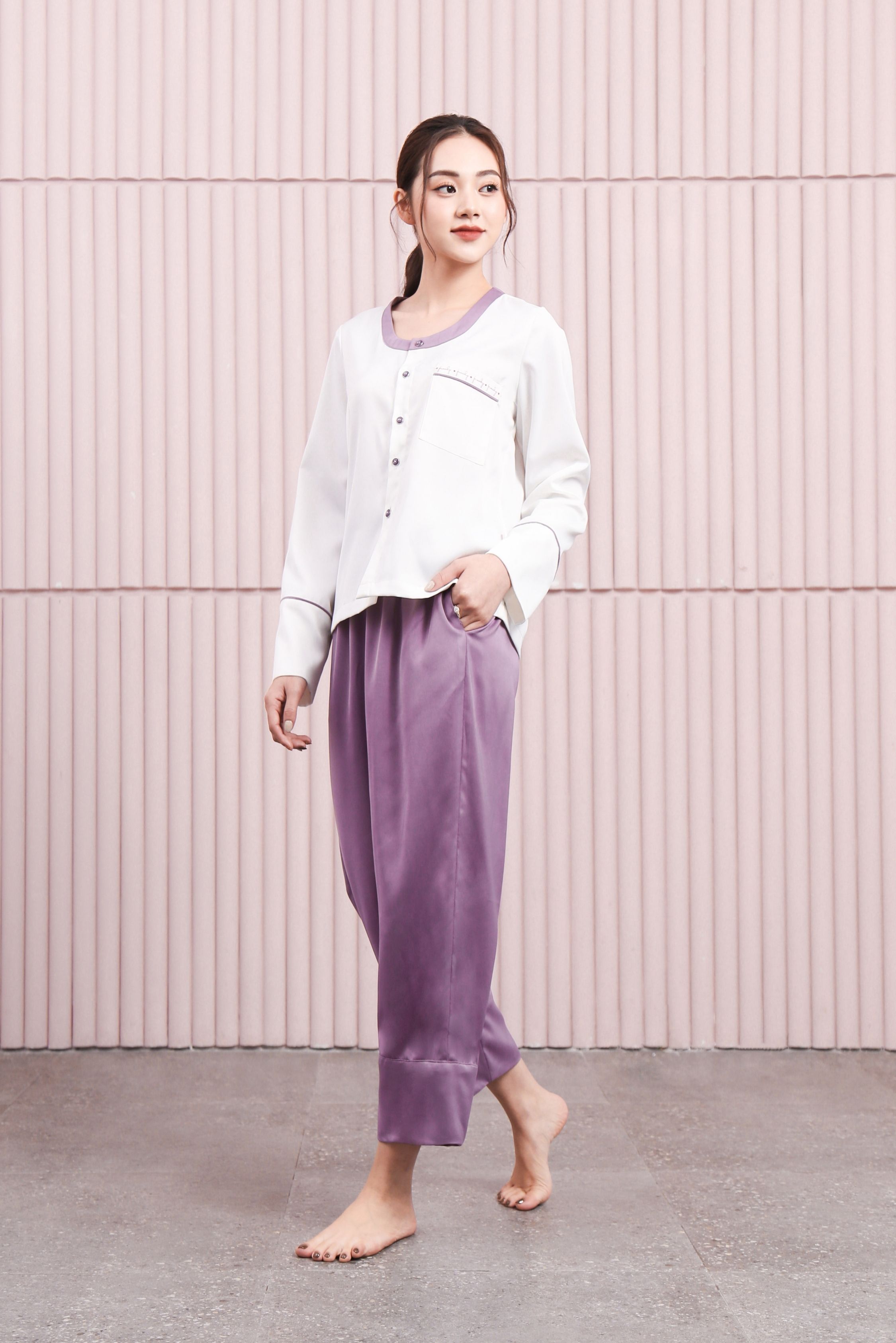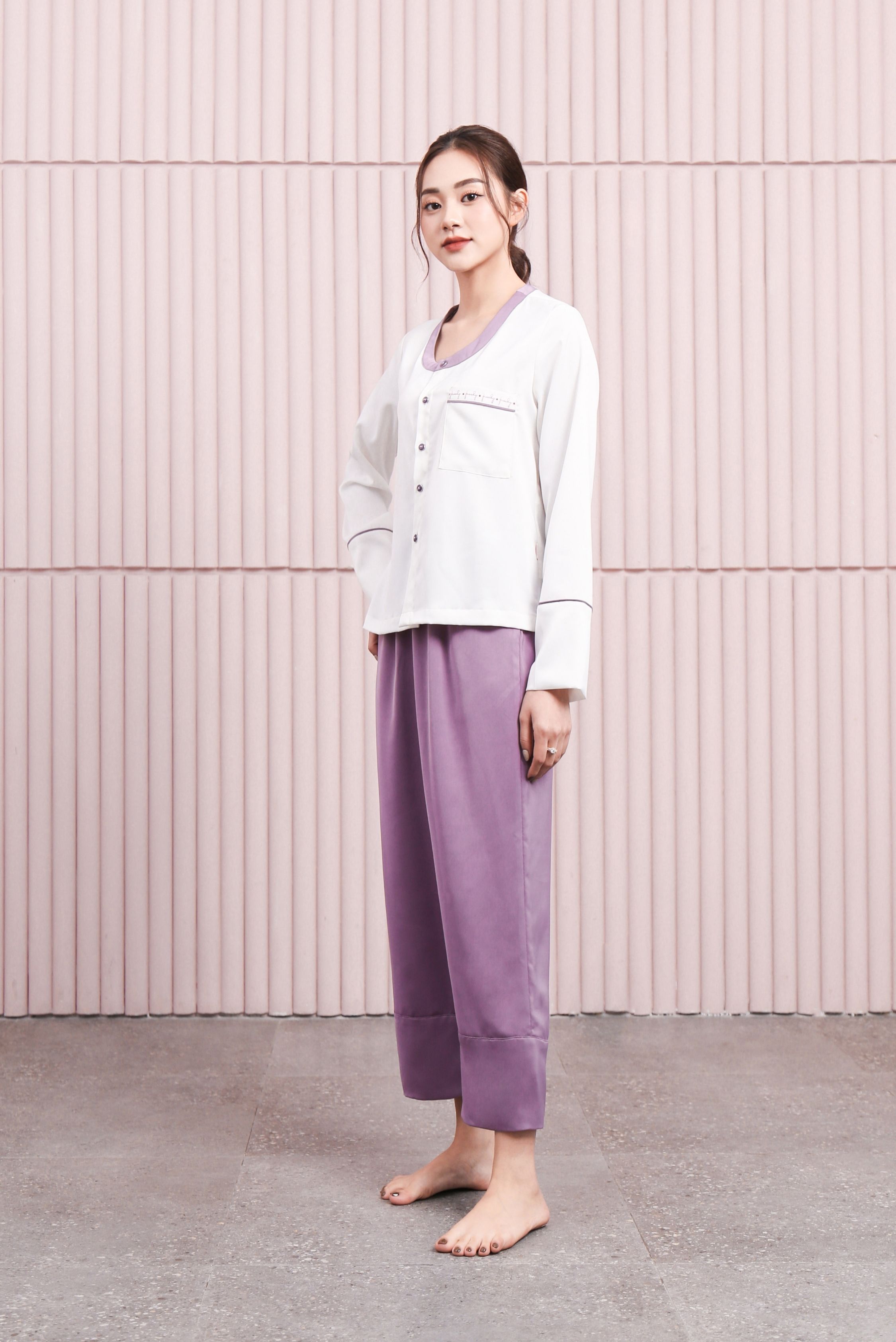 Với điểm nổi bật set pijama: Bộ dài tay lụa hàn với chất liệu mêm mại ưng ý, thu hút ngay từ cái nhìn đầu tiên với màu tím nhã nhặn