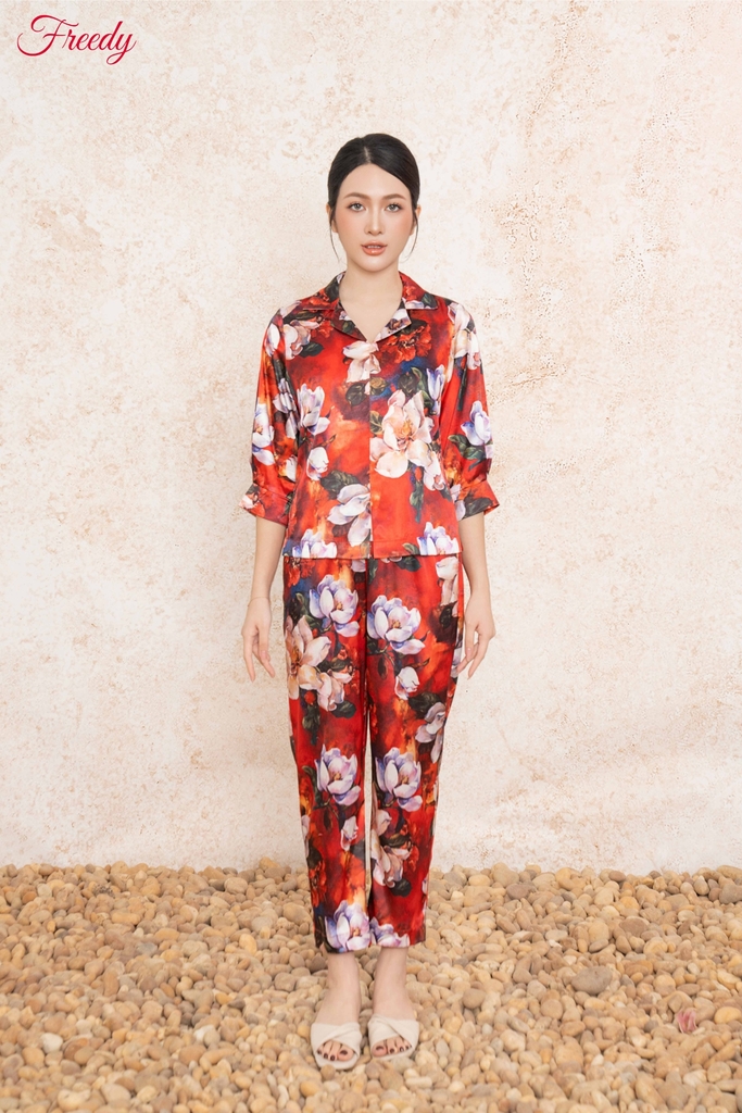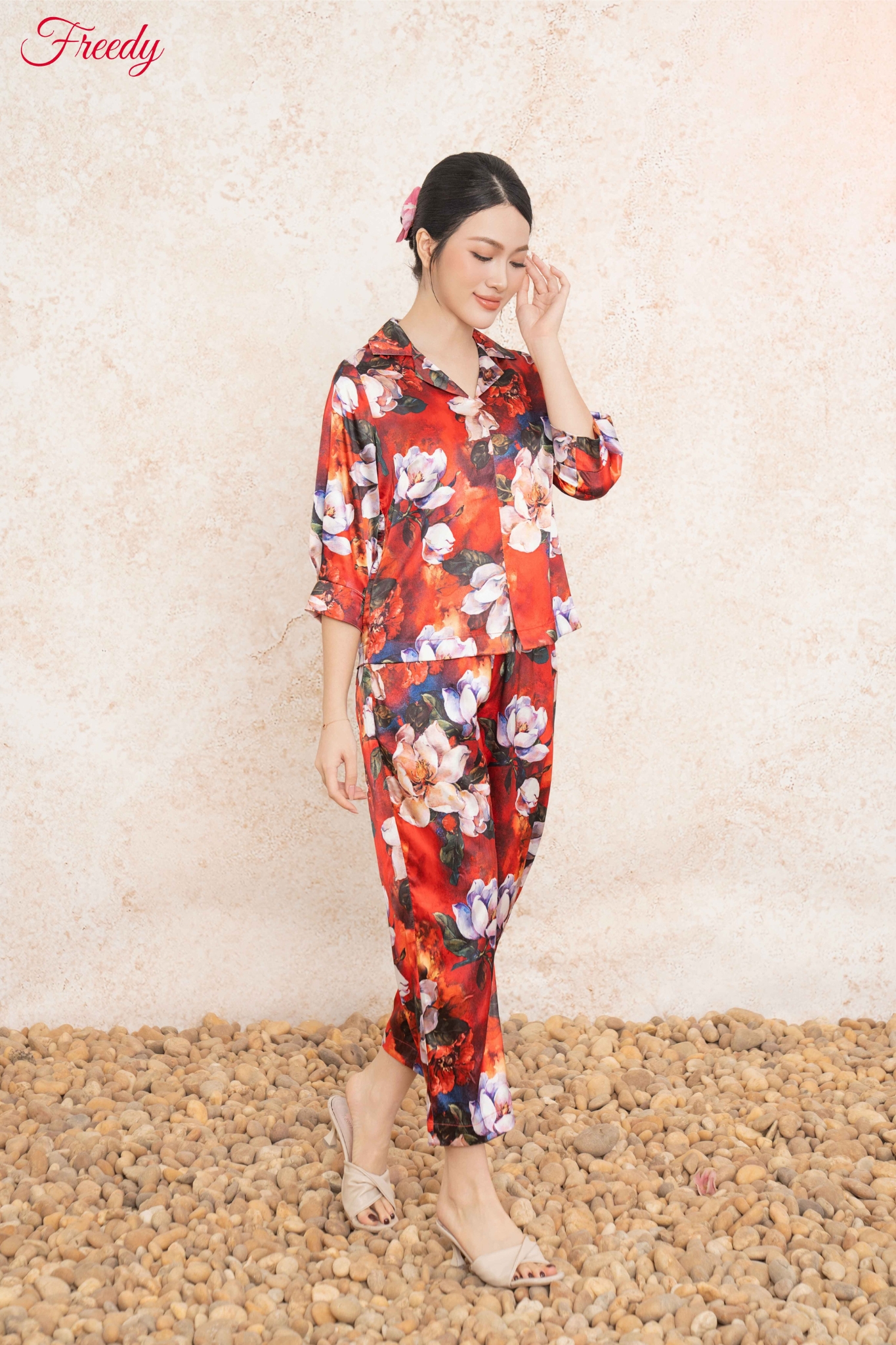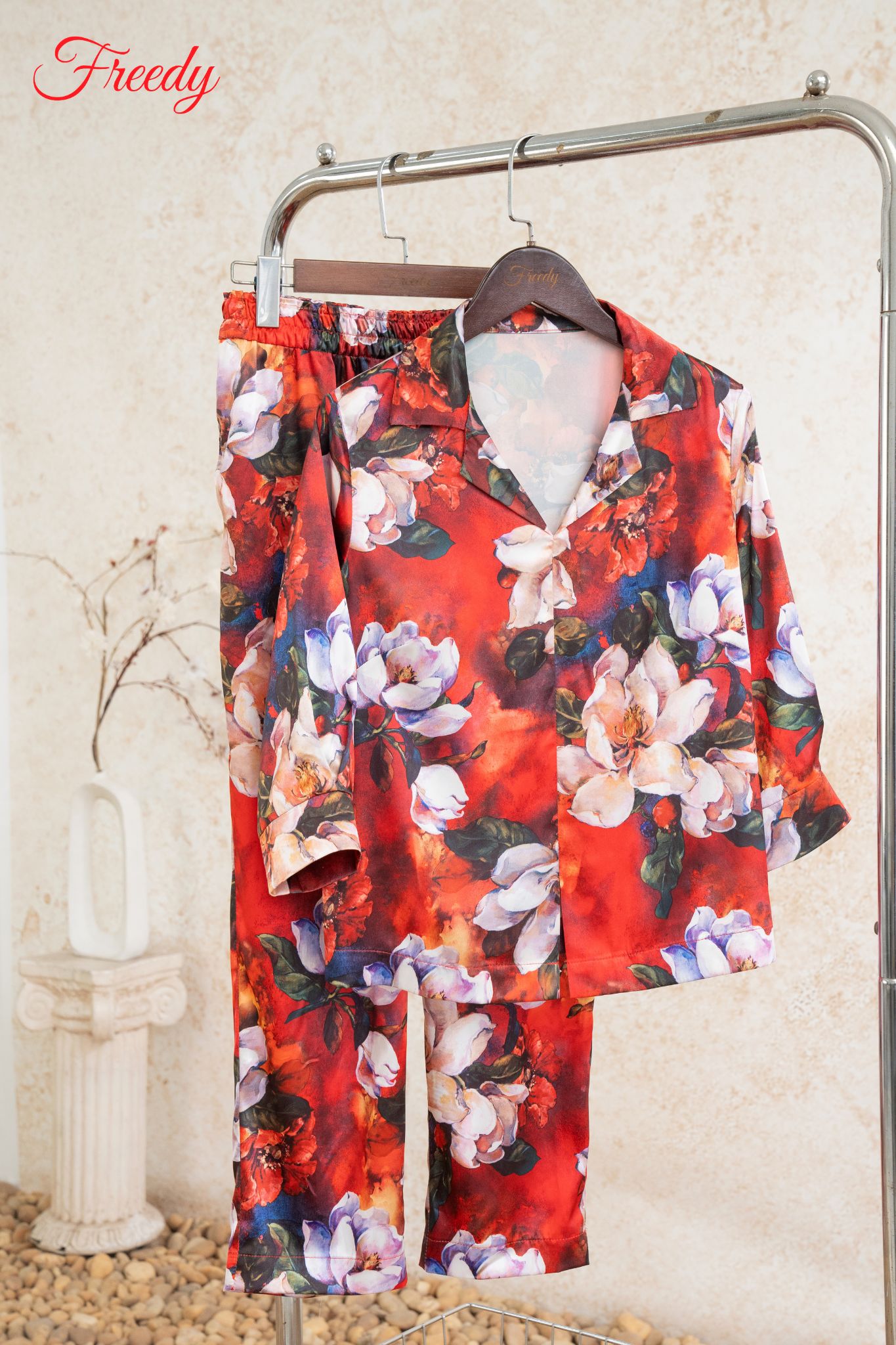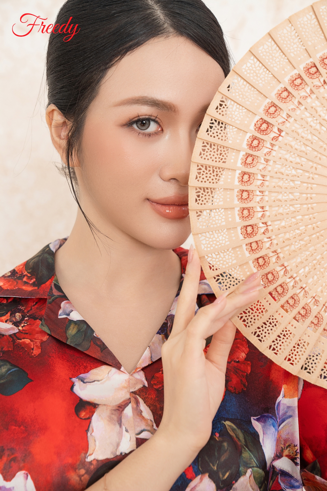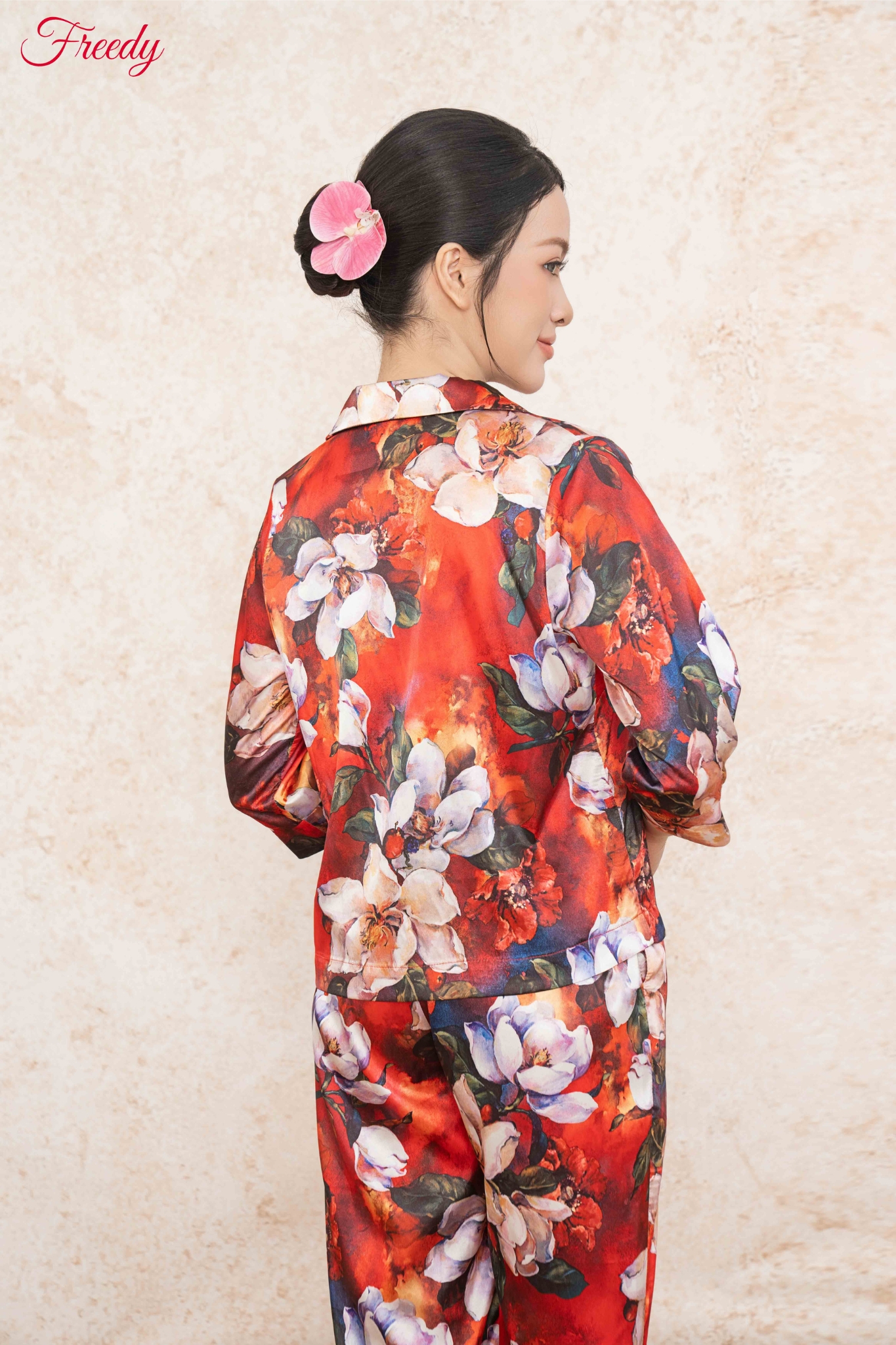 Họa tiết hoa mộc lan cách điệu trên nền đỏ may mắn. Biểu tượng của phú quý – thanh cao – khởi đầu trọn vẹn. Rất phù hợp mặc dịp năm mới, lễ Tết, gặp gỡ gia đình hoặc làm quà tặng ý nghĩa.