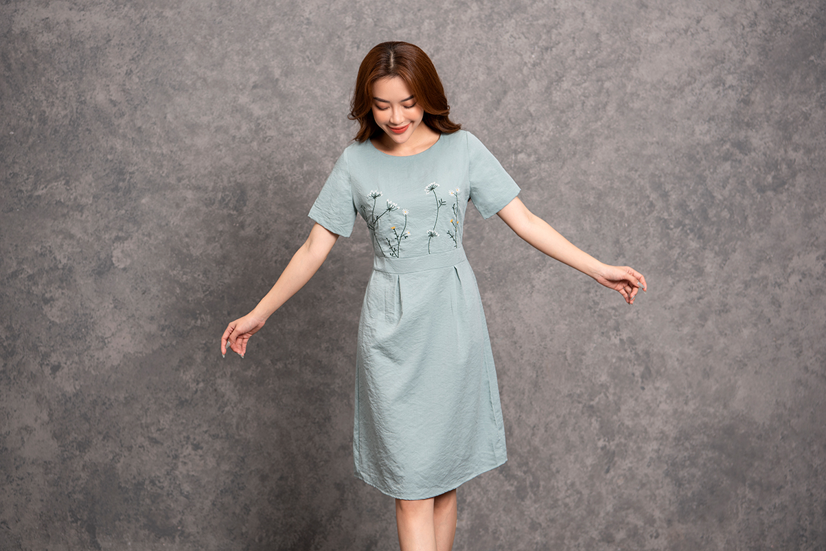 -Váy xanh ngọc cổ tròn tay cộc có đường cắt ngang eo. Thân trước có bản đai 4 cm, thân trên có thêu trang trí, thân trước có ly súp 2 bên.